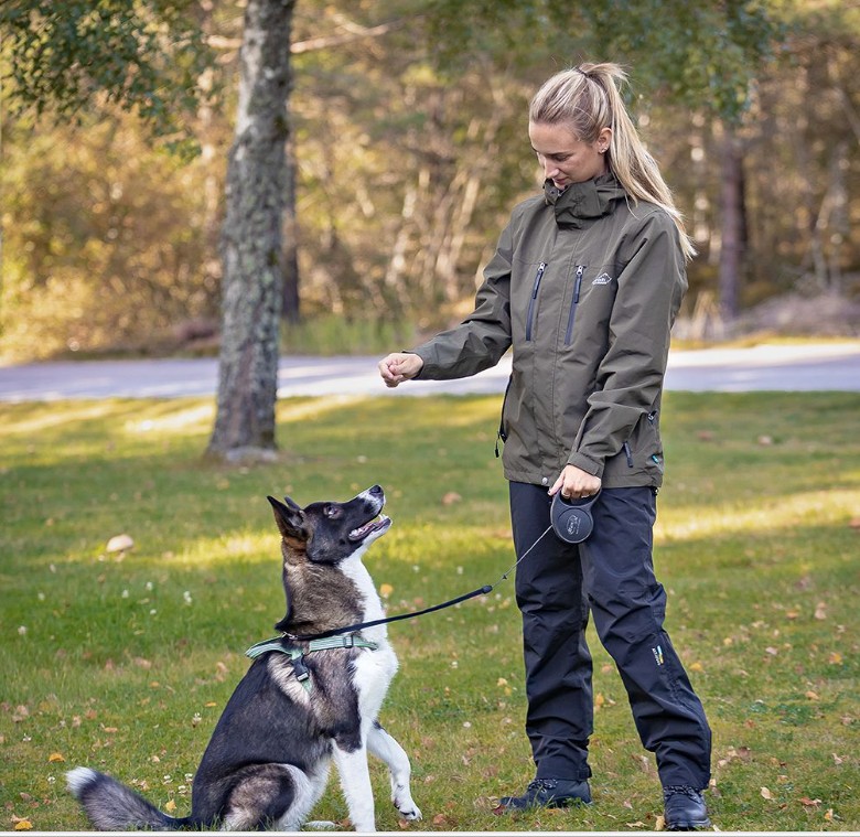 Regnjakken er fremstillet i lamineret polyester som både er blød og behagelig at have på. Indvendig er der mech som sikrer perfekt ventilation. Med et vandsøjletryk på 10000mm og en åndbarhed på 5000ml ,kan du garanteret holde dig tør når du skal være aktiv med i din hund i selv det dårligste vejr.