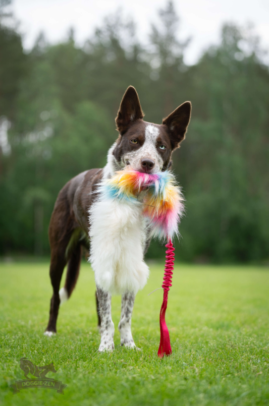 Doggie-Zen Octopus har 3 arme som er lavet af kraftig ægte lammepels, de er forbundet et et stort bideområde med luksoriøs fake pels i smuk regnbuefarve. Dertil et stærkt og holdbart bungee håndtag. Materialet er lokkende og fluffy og hundene elsker det.