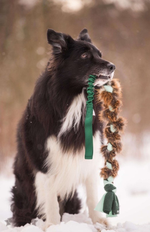Her får du lækkert fleeceflettet legetøj med fyldig ræveskind fra svenske ræve og et bungee-håndtag for en mere behagelig trækkeoplevelse. Bungee håndtaget reducerer ryk i både hundens nakke og førerens skulder.