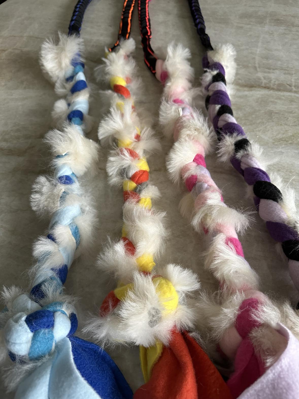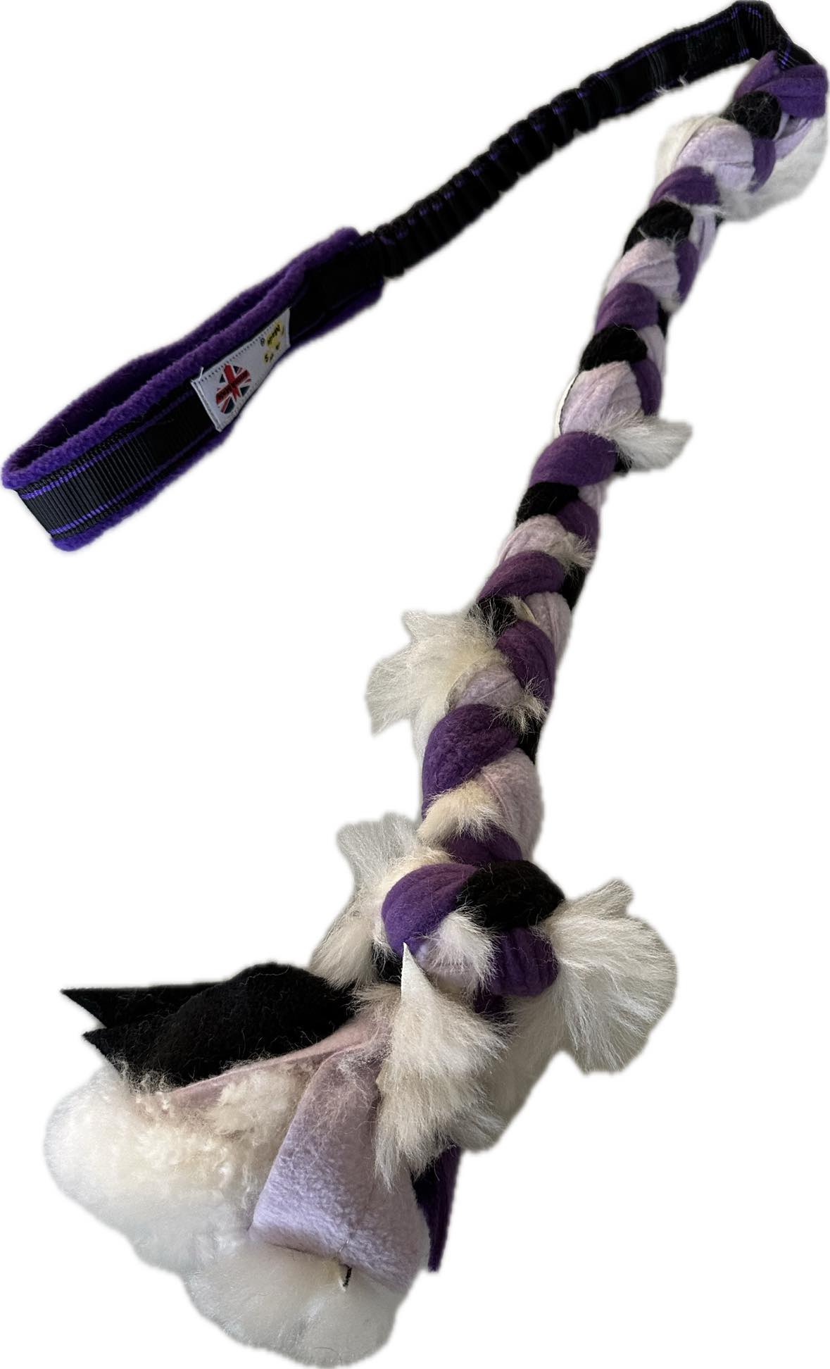 Paws Made Sport Bungee kombineret med tre fleecestykker og ægte pels, der er syet ind i dem og derefter flettet til et trækkelegetøj med en bungee og en knude i enden. Legetøjet måler mellem 80-90 cm i længden.