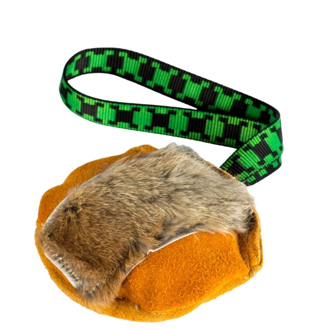 Ydersiden er lavet af blød finsk elglæder og dækket med ægte kaninpels – en tiltalende kombination der giver høj belønningsværdi i træning og leg. Bolden har en kraftig nylon strop som gør den nem at kaste, eller holde ved trækkeleg.
