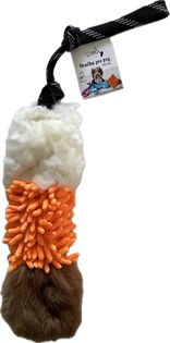 Dette top lækre combi hundelegetøj er fremstillet af forskellige materialer og teksture som din hund vil elske at sætte tænderne i. Den yderste del er ægte kaninpels, midten er blød moppe i mikrofibre og øverste del er kraftig lammepels, forbundet med et kraftigt håndtag. Midten med mikro moppe indeholder en squeaker. Legtøjet et designet til selv den kraftigste trækkeleg.