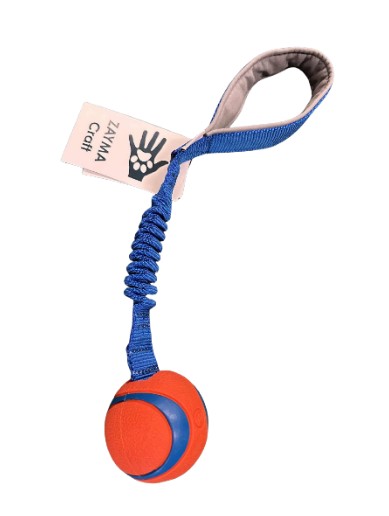 Zayma Craft legetøj med den populære Chuckit bold og et solidt bungee håndtag. Chuckit bold er en populær belønningsbold i hundesport. Her er Chuckit bolden sat på et kraftigt bungee håndtag. Dette legetøj er perfekt til hunde som elsker bolde. Du kan belønne med både kaste belønning og sjov trækkeleg.