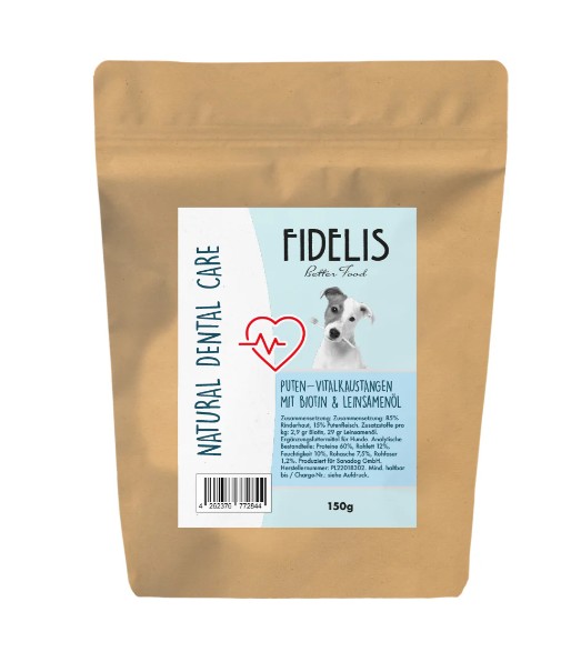 FIDELIS Vital Tyggestænger er fremstillet af naturlig oksehud og mørt kalkunkød, beriget med biotin og hørfrøolie – den perfekte kombination af tyggeglæde, tandpleje og næringsstoffer.