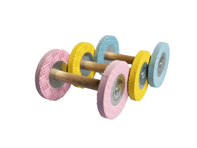 Bemærk: Apporten på billederne er sat sammen med en lille metalskive på ydersiderne. Denne NYE model har skiver af træ med logo i stedet. Dette er mere skånsomt for hvalpens tænder og tandkøb hvis den kommer til at tage apporten på sidestykkerne.