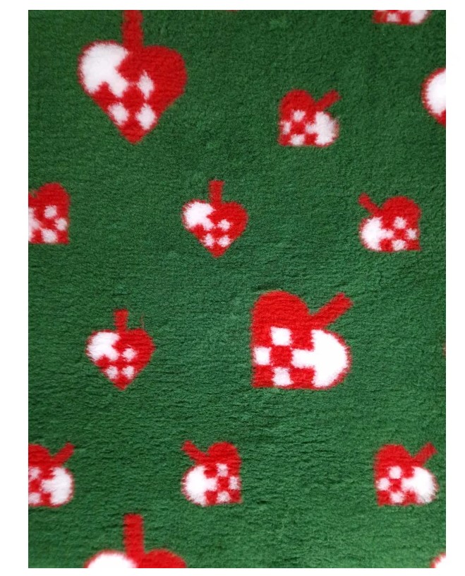 Super skønt Vetbed i mørkegrøn med fine røde julehjerter. Vetbed tæppet er i den kraftigste kvalitet på det danske marked (30mm)