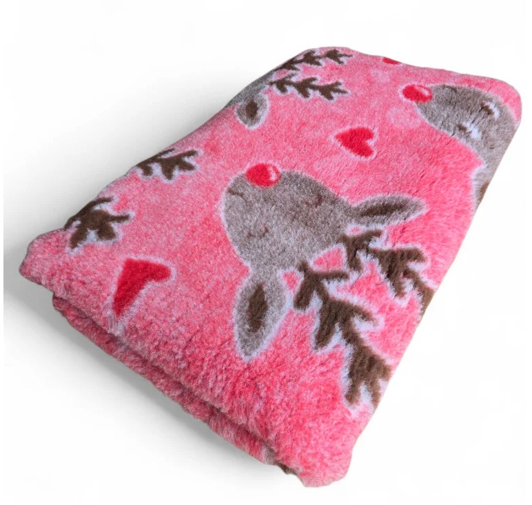 Super skønt Vetbed i flot lyserød med søde rensdyr. Vetbed tæppet er i den kraftigste kvalitet på det danske marked (30mm)